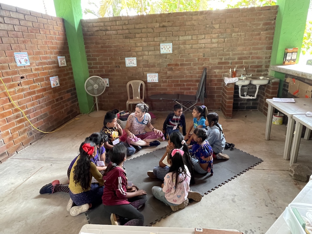 Volunteer Amanda Wheeler-Kay leads children in a class in tooth brushing as the kids wait their turn to see a dentist in the Suchitán school clinic.